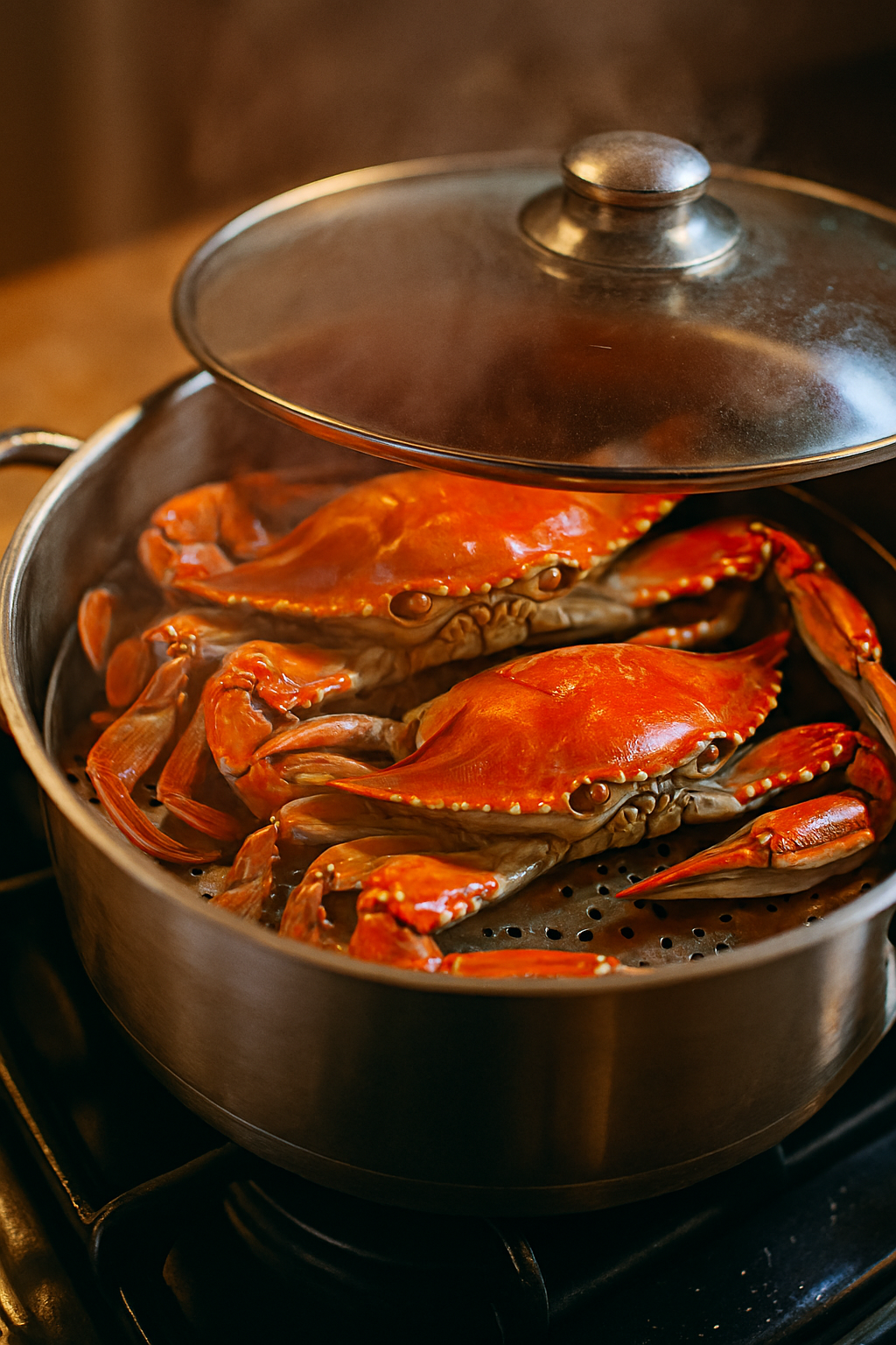 - 냄비에 물을 붓고 찜기를 올려 꽃게를 넣어요.